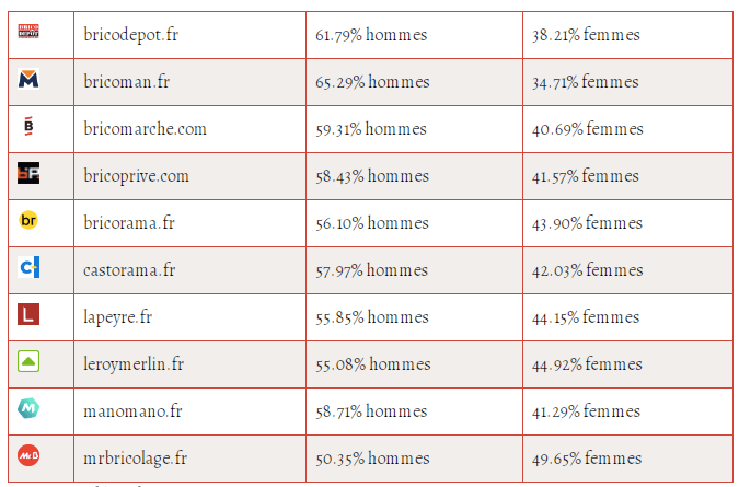 Un indicateur intéressant auquel on peut s’intéresser pour avoir une idée de l’attrait au bricolage selon le genre concerne l’audience des sites des grandes enseignes de bricolage.